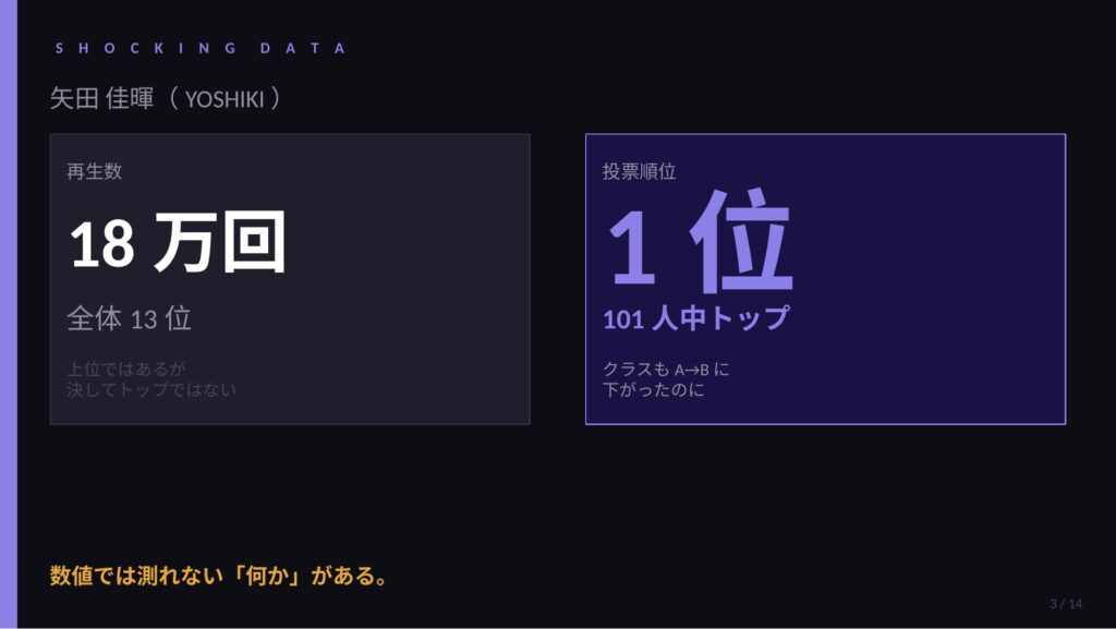 矢田 佳暉(YOSHIKI)は再生数18万回で全体13位。トップ層にはいるが、ダントツではない。ところが投票順位は1位。101人中トップだ。