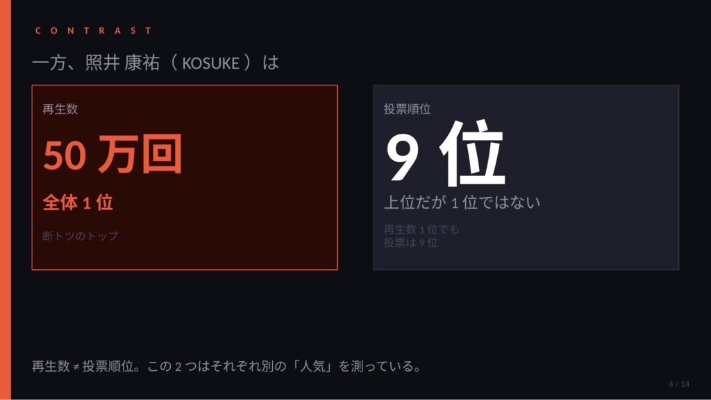 トップ10には入っているが、再生1位なのに投票1位ではない。この2人を並べると「再生数と投票順位は別々の何かを測っている」ということが数値としてはっきり見えてくる。