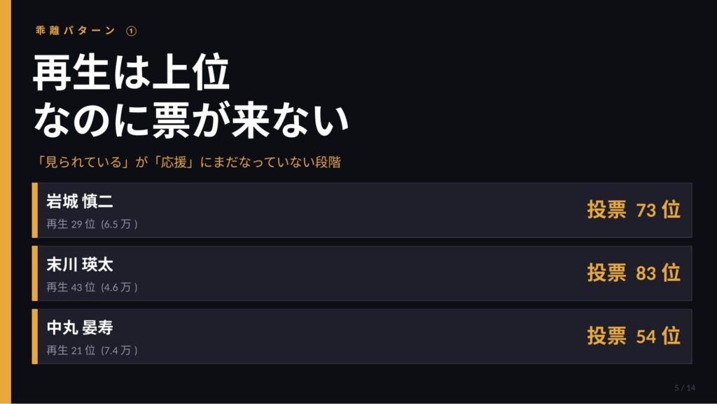 これは「見られてはいるけど、まだ応援したいには繋がっていない段階」と読める。放送回数が増えて、ファンの「気になる」が「好き」に変わったとき、票が動くと思っている。