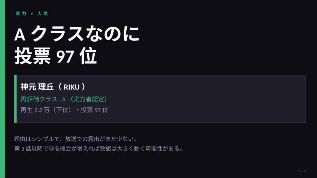 神元 理丘(RIKU)は再評価でAクラスに認定された実力者だ。しかし再生数は2.2万回で下位、投票順位は97位。